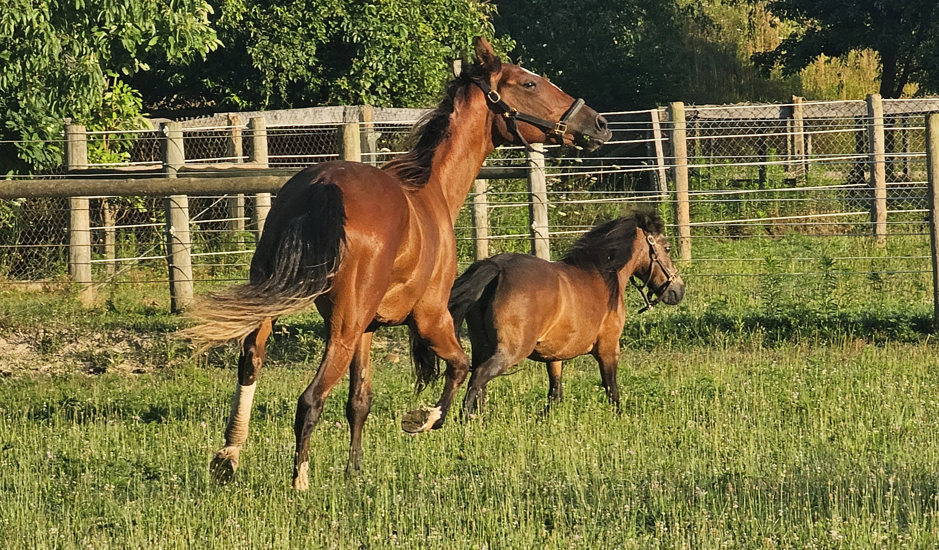 At home, Rhodena Blue and Queenie are inseparable in the field. The Standardbred steps up to protect her smaller companion when necessary.